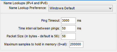 The Packet Size can make a considerable difference in latency performance. Normally, you want to use a relatively small number here. The default is 56 bytes, but in some cases you might need to lower this. Large packets should be used with great care. A 1500 byte packet means MultiPing may be sending out 30-50 K per second worth of data, which can cause its own problems (and makes measuring latency more challenging).